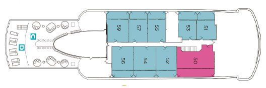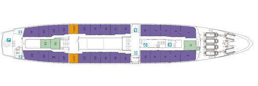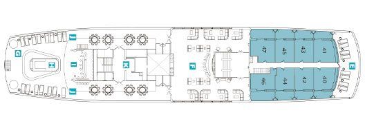| Social areas: | Sun deck/terrace, shaded outside deck, bar, living room, dining room+ |