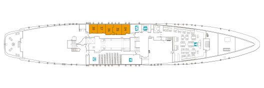 | Social areas: | Sun deck/terrace, shaded outside deck, bar, living room, dining room+ |