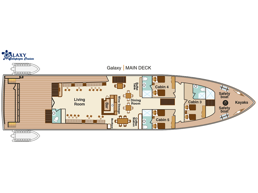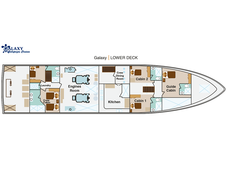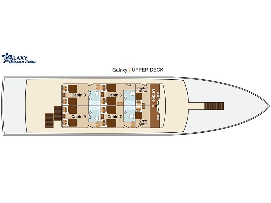 The Galaxy has nine cabins with all private facilities , two cabins in lower deck , three cabins on main deck and four on upper deck and the beds can either form a fake queen size or two individual beds. She offers tours of 4,6,8 or 15 days. Experience the Galapagos islands on board the first class yacht Galaxy.