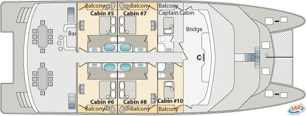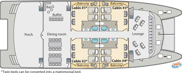 | Accommodations: | -Main Deck: 2 Suites 409 ft² / 38m² (private balcony). 2 Double Staterooms 258 ft² / 24 m² (private balcony) -Upper Deck: 4 Connected Cabins 258 ft² / 24 m² (private balcony) |