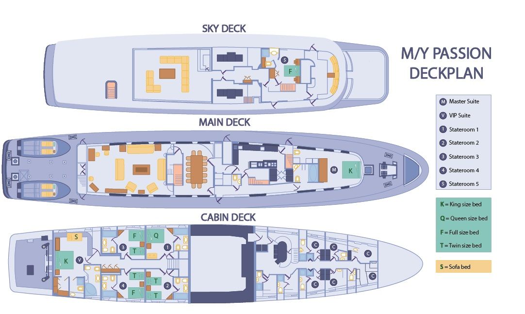 The M/V Passion’s 159 feet in length offers the most comfort for families or small groups in a private charter, on its four decks offers plenty of cabin room and social areas such as al fresco dining or a jacuzzi to relax in privacy.Weather permitting all meals will be served al fresco offering a service and cuisine one of its kind while enjoying the wonderful views the islands offer to all. Accommodations are divided in four staterooms each fully air conditioned with private bath and bath tub , in addition to these there is a VIP and Master Suit with two en suit bathrooms each.