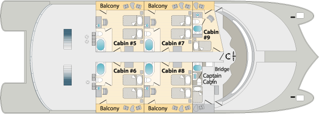 | Accommodations: | -Main Deck: 2 Suites 409 ft² / 38m² (private balcony). 2 Double Staterooms 258 ft² / 24 m² (private balcony) -Upper Deck: 4 Connected Cabins 258 ft² / 24 m² (private balcony) |