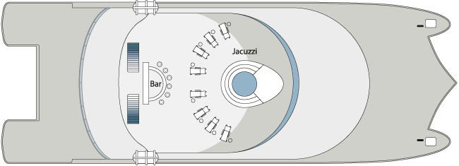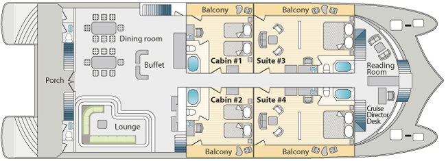 | Accommodations: | -Main Deck: 2 Suites 409 ft² / 38m² (private balcony). 2 Double Staterooms 258 ft² / 24 m² (private balcony) -Upper Deck: 4 Connected Cabins 258 ft² / 24 m² (private balcony) |