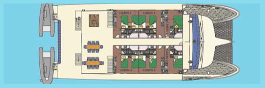 The M/C Tip Top II is a catamaran that provides great itineraries from up to 14 nights during a Galapagos cruise, all its departures are from Baltra airport and the prices normally include the flight ticket from the mainland of Ecuador to the islands. It has capacity for 16 guests all in double cabins with single beds or full size , the cabins have large windows providing incredible ocean and islands views, air conditioned, private bathrooms and lots of cabin space.